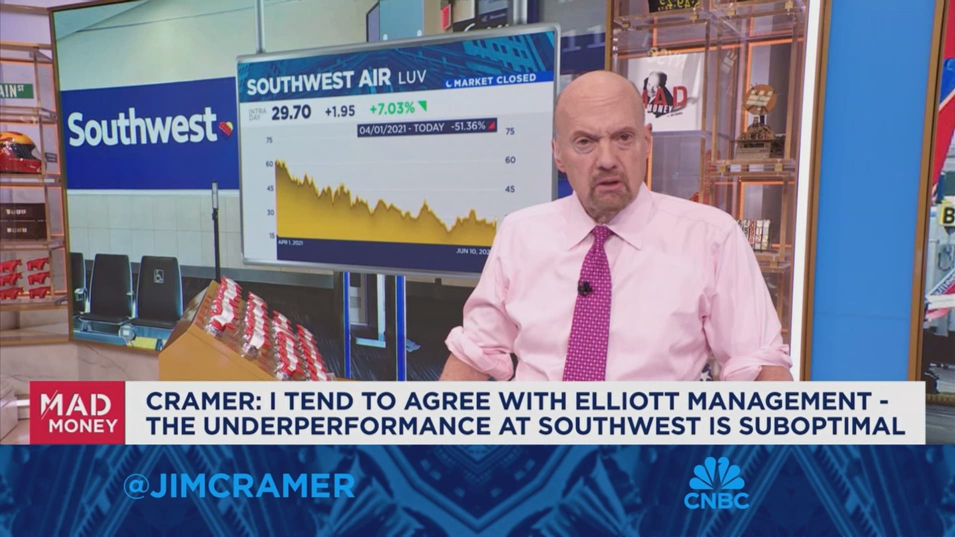 Jim Cramer on CNBC’s Opening Bell was talking about Southwest airline stock and whether the stock had been impacted by Boeing’s issues with the 737 Max.  Cramer said Southwest and Boeing have an excellent relationship and that Southwest didn’t “kick them (Boeing) under the table” when they were having problems. This is a mashup of “kick (someone or something) to the curb” (to be discarded or dismissed due to being unwanted), “off the table” (withdrawn or no longer available) and “drink (someone) under the table” (to be able to drink more alcohol than someone else). I included both “table” idioms as “off the table” seems to fit in the context but the word “under” is present making me think Cramer was also thinking, for some reason, of the drinking idiom. A big thank you to John Hatfield Jr. for hearing this one and sending it in!