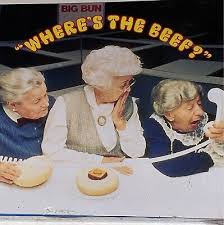 “Where’s the beef?” is a catchphrase in the United States and Canada, introduced as a slogan for the fast food chain Wendy’s in 1984. Since then it has become an all-purpose phrase questioning the substance of an idea, event, or product. In the ad, titled “Fluffy Bun”, actress Clara Peller receives a burger with a massive bun but a tiny patty from a fictional competitor, which uses the slogan “Home of the Big Bun”. The small patty prompts Peller angrily to exclaim, “Where’s the beef?” Director Joe Sedelmaier actually wanted Peller to say, “Where is all the beef?” but because of emphysema, that was too hard for her.
