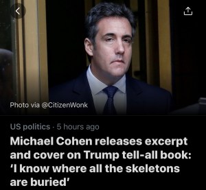 Posted: August 14, 2020 Filed under: Uncategorized | Tags: Disloyal, expressions, humor, know where all the bodies are buried, language, malaphor, malaphors, Michael Cohen, skeletons in the closet, Trump, words Leave a commentThis perfectly formed malaphor is found in the foreward to Michael Cohen’s soon to be released tell all book, “Disloyal”. Here is the context: